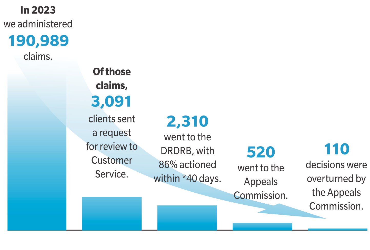 If after a review by the DRDRB, a worker or employer still disagrees with a decision, the independent and external Appeals Commission is the next step in the process. If the Appeals Commission disagrees with the DRDRB’s decision, we implement the changes quickly and connect with the impacted party within five days of the decision from the Appeals Commission.