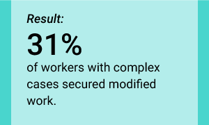 Our goal: Negotiate safe modified work options for at least 30% of workers with complex cases (greater than 30 days) when they become fit to perform light duties.